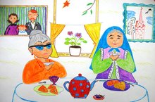 В школе проходит выстака "Добрые соседи". Ученики школы рисуют своих соседей.