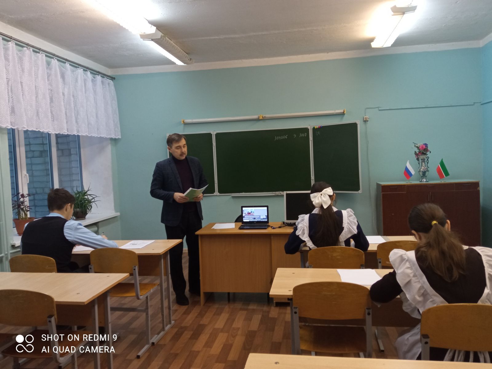 Татарстанның халык язучысы,тел-әдәбият галиме,күренекле фольклорчы,милләтебез каһарманы турында мәгълүмат бирелде.Укучылар төрле тематикага багышланган мәкальләр,табышмаклар әйтештеләр Һәм тел турында матур әйтемнәрне искә төшерделәр.Алар телебезне,мәдәниятебезне үстерүдә зур өлеш керткән шәхесләрне барладылар. -