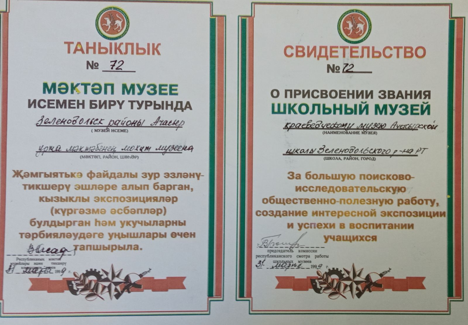 Свидительство о присвоении звания Школьный музей №72 от 31.03.1999 г.