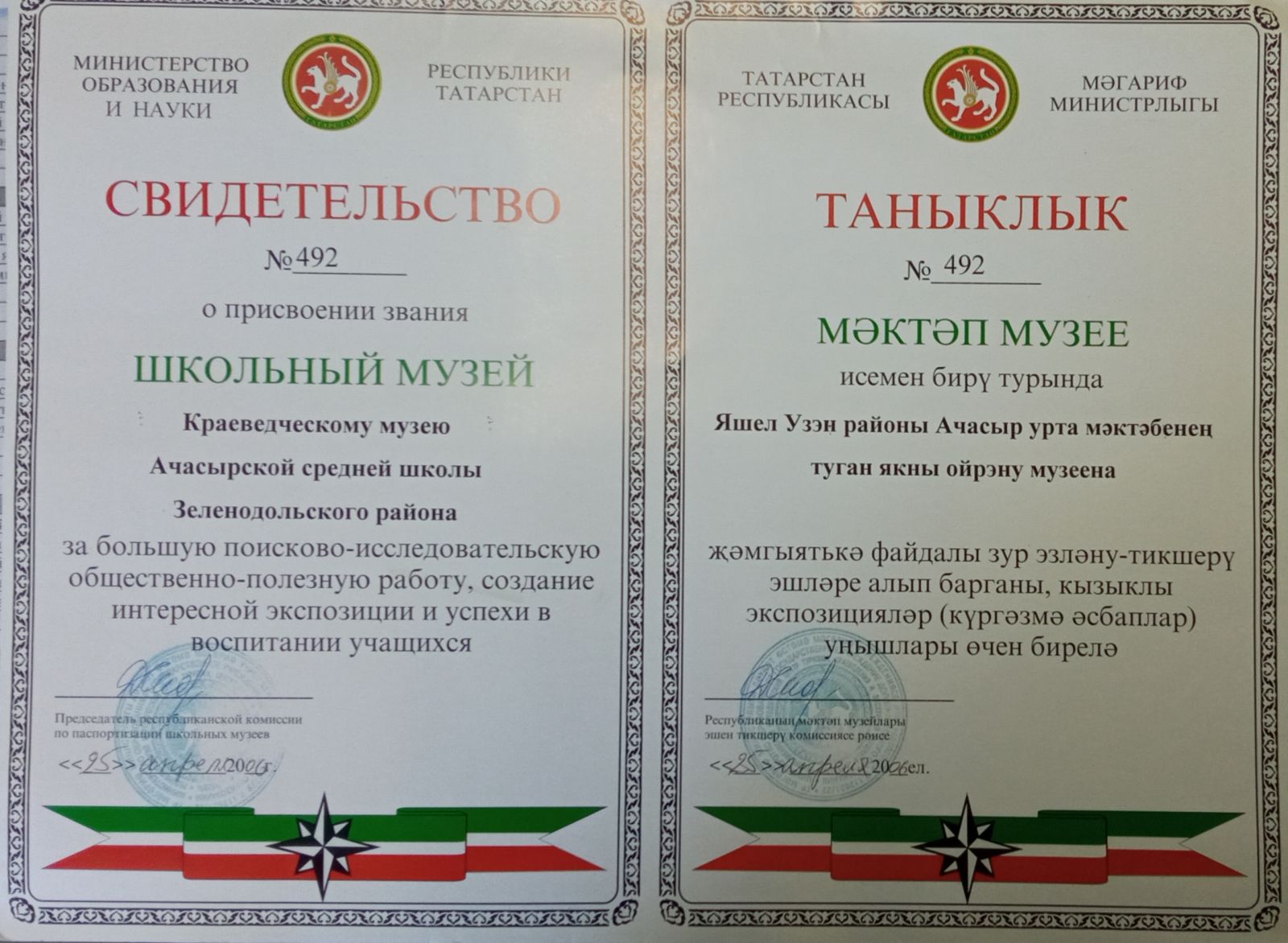 Свидительство о присвоении звания Школьный музей №492 от 25.04.2006 г.