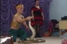 Сегодня внашей школе дает свое представление Омский цирк "Овация". Программа очень интересная: лилипуты, пудель, змеи, игуана и, кончно же, клоуны. Программа все очень понравилась. Спасибо артистам!!!
