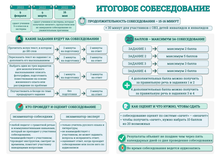 Итоговое собеседование проводится во вторую среду февраля (12 февраля 2025 года). Дополнительные сроки проведения итогового собеседования — вторая рабочая среда марта и первый рабочий понедельник мая. Итоговое собеседование направлено на проверку коммуникативной компетенции обучающихся IX классов — умения создавать монологические высказывания на разные темы, принимать участие в диалоге, выразительно читать текст вслух, пересказывать текст с привлечением дополнительной информации.