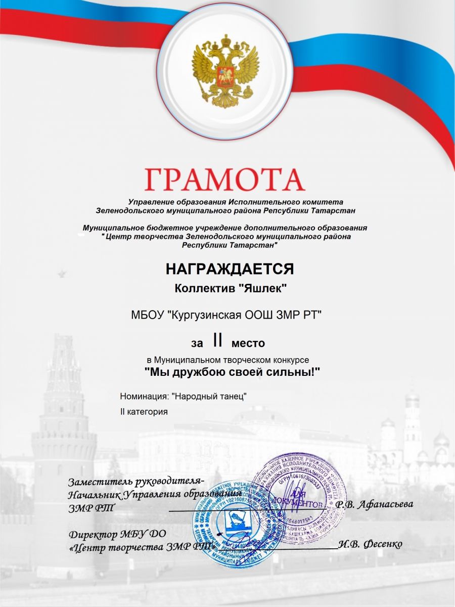 Творческий коллектив нашей школы "Яшьлек" под руководством Галялиевой Ф.Г. занял II место в Муниципальном творческом конкурсе "Мы дружбою своей сильны!" в номинации народный танец.