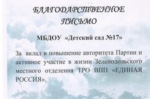 Детский сад получил благодарственное письмо руководителя Зеленодольского исполнительного комитета ЗМО ТРО ВПП "Единая Россия" В.В. Кузнецова за вклад и повышение авторитета Партии и активное участие в жизни Зеленодольского местного отделения ТРО ВПП "Единая Россия".