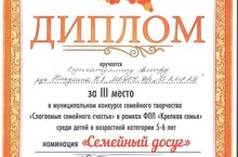 11 марта подведены итоги муниципального творческого конкурса «Слагаемые семейного успеха» в рамках федерального партийного проекта «Крепкая семья». По итогам конкурса Сунгатуллин Амир - воспитанник подготовительной группы №4 занял третье место в номинации «Семейный досуг». Поздравляем призёра конкурса и желаем Амиру новых творческих успехов!