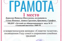 Поздравляем семью Поповых, принявших участие в межрегиональном конкурсе «Соцветие талантов» среди воспитанников детских садов Республики Башкортостан и Республики Татарстан с почётным 1 местом. В номинации "Песня из мультфильмов", семья исполнила "Песню разбойников" из мультфильма "Бременские музыканты". Желаем нашим участникам успехов и дальнейших побед!Татарстан һәм Башкортстан балалар бакчалары арасында уздырылган төбәкара бәйгедә, “Мультфильмнан җыр” номинациясендә 1- нче урын яулаган Поповлар гаиләсен җиңүләре белән котлыйбыз, киләчәктә иҗади уңышлар теләп калабыз!