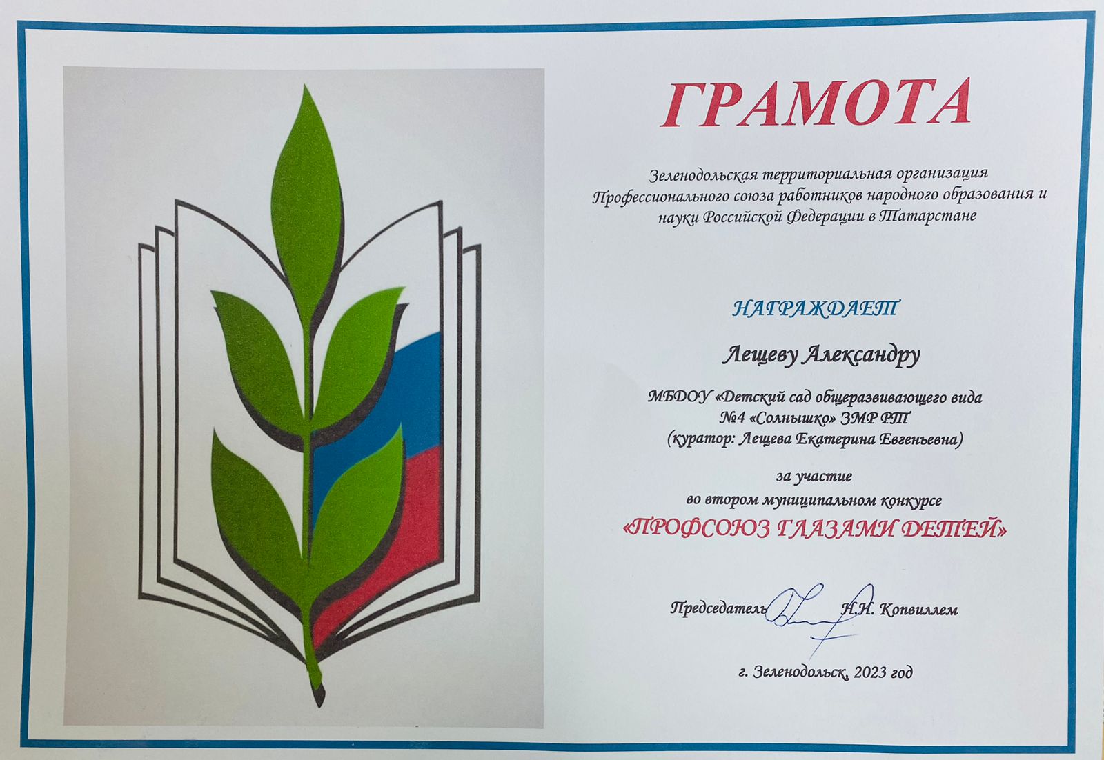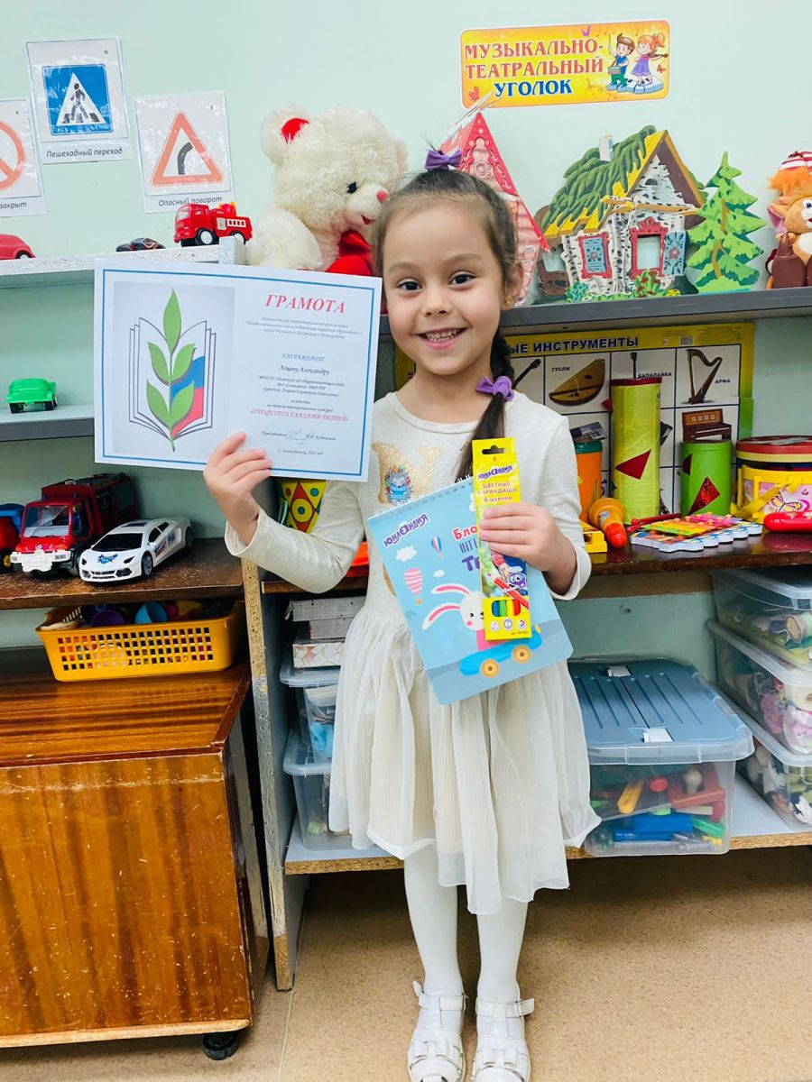 Безнең яшь тәрбияләнүчебез Лещева Александра «балалар күзләре белән Профсоюз»конкурсында катнашканы өчен грамота алды.