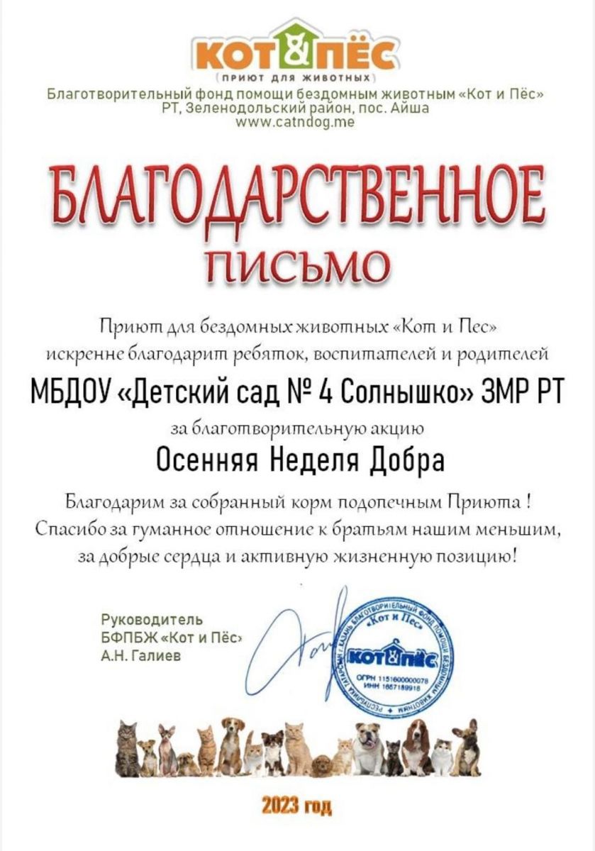 Безнең балалар бакчасында тәрбияләнүчеләр, ата-аналар һәм педагоглар "Көзге игелек атнасы"хәйрия акциясендә катнаштылар. Галиев Альберт Наил улы БФПБЖ директоры "мәче һәм эт Игелек дәресләре"үткәрде. "Яхшылык дәресләре" программасы үсеп килүче буынга әйләнә-тирә дөньяга һәм шул исәптән "кече кардәшләребезгә"карата кешелекле һәм җаваплы мөнәсәбәт тәрбияләүне максат итеп куя. Бу бик мөһим, ярдәм итү теләге гадәти күренешкә әйләнсен өчен, безнең балаларыбыз игелекле һәм ярдәмчел кешеләр булып үссен өчен, авыр хәлдә калганнарга ярдәм кулы сузуның мөһимлеген аңлыйлар, һәм кеше яки хайван мөһим түгел... Альберт Наильевич кечерәк кардәшләребезгә кешелекле мөнәсәбәтләре өчен рәхмәт хаты тапшырды.