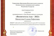 Конкурс "Воспитатель года 2022"/ "Ел тәрбиячесе-2022"конкурсы 24.01.2022 20 января 2022 года на базе МБДОУ № 55 "Килэчэк" состоялся муниципальный этап Всероссийского конкурса "Воспитатель года-2022". От нашего детского сада выступила воспитатель Махмутова Гульназ Рафиловна, прошла испытания и получила Грамоту участника. Поздравляем!