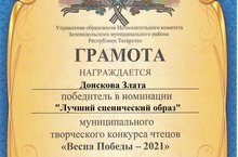 Муниципальный творческий конкурс чтецов «Весна Победы-2021»/ «Җиңү язы-2021» дип аталган муниципаль иҗади конкурс 01.06.2021 Поздравляем воспитанницу нашего детского сада Донскову Злату с победой в номинации «Лучший сценический образ». Молодец!!!
