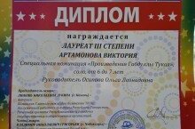 Поздравляем Артамонову Викторию и воспитателя группы Осипову О.Л. в получениеи Диплома ЛАУРЕАТА 3 степени во всероссийском конкурсе детского и юношеского творчества "Звездная карусель" . МОЛОДЕЦ!