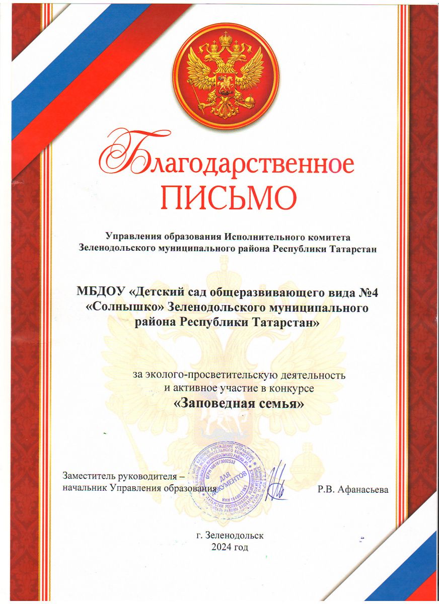 Коллектив нашего детского сада был отмечен благодарственным письмом Управления образования Исполнительного комитета Зеленодольского муниципального района Республики Татарстан за эколого-просветительскую деятельность и активное участие в конкурсе «Заповедная семья».