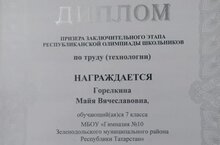 Котлыйбыз! Технология буенча республика олимпиадасы призеры - 7 нче сыйныф укучысы Горелкина М. һәм технология укытучысы Костылева Т.В. Без сезнең белән горурланабыз!