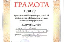 16 декабря состолась муниципальная научно-практическая конференция "Лобачевские чтения", ученик 6-го класса нашей гимназии Салаев Игорь стал призерем в секции "Информатика". Поздравляем! Желаем побед и в будущем.