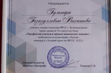 Химия укытучысы Вахитова Гөлнара Газизулла кызы «Химия» номинациясендә «ФГОС – 2022 буенча иң яхшы дәрес " конкурсында җиңүче булды.