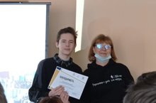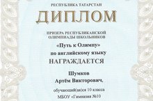 Ученика 10а класса Шумкова Артёма - призёра Республиканской олимпиады «Путь к олимпу» по английскому языку. Подготовила призёра учитель английского языка Ибрагимова Флюра Мустакимовна.
