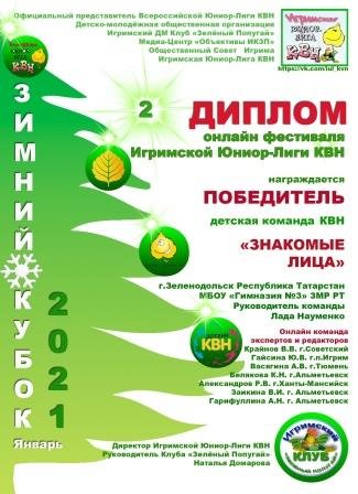 С 6 по 13 января команда КВН гимназии принимала участие в Зимнем кубке Игримской Юниор-Лиги КВН ХМАО 14.01.2021