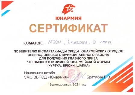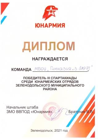 Виват, Юнармия! Сегодня, 23 сентября 2021 года, юнармейский отряд гимназии получил заслуженную награду-переходящий кубок победителя III Спартакиады Юнармейских отрядов Зеленодольского муниципального района. Успешно преодолев десять этапов, ребята поставили красивую финальную точку: сняли видеоролик о школьном музее космонавтики. В общекомандном зачёте наша команда обошла ближайшего преследователя - юнармейцев СОШ №11- на 13 очков. Самыми активными юнармейцами по итогам Спартакиады стали: Гильяльдинов Д., Петров М., Макришин Я., Шмарина Т., , Романов А..
