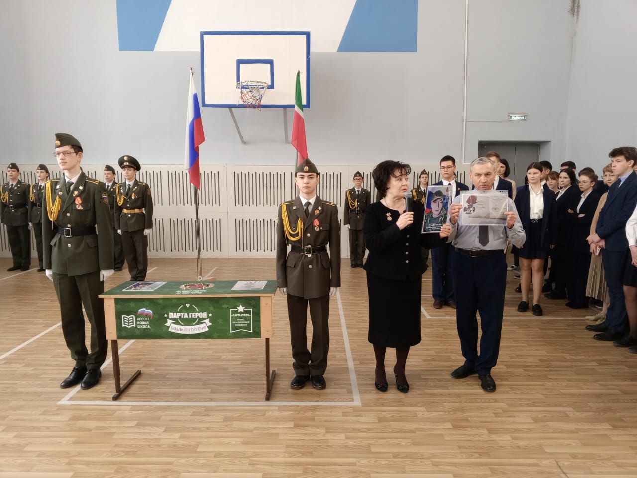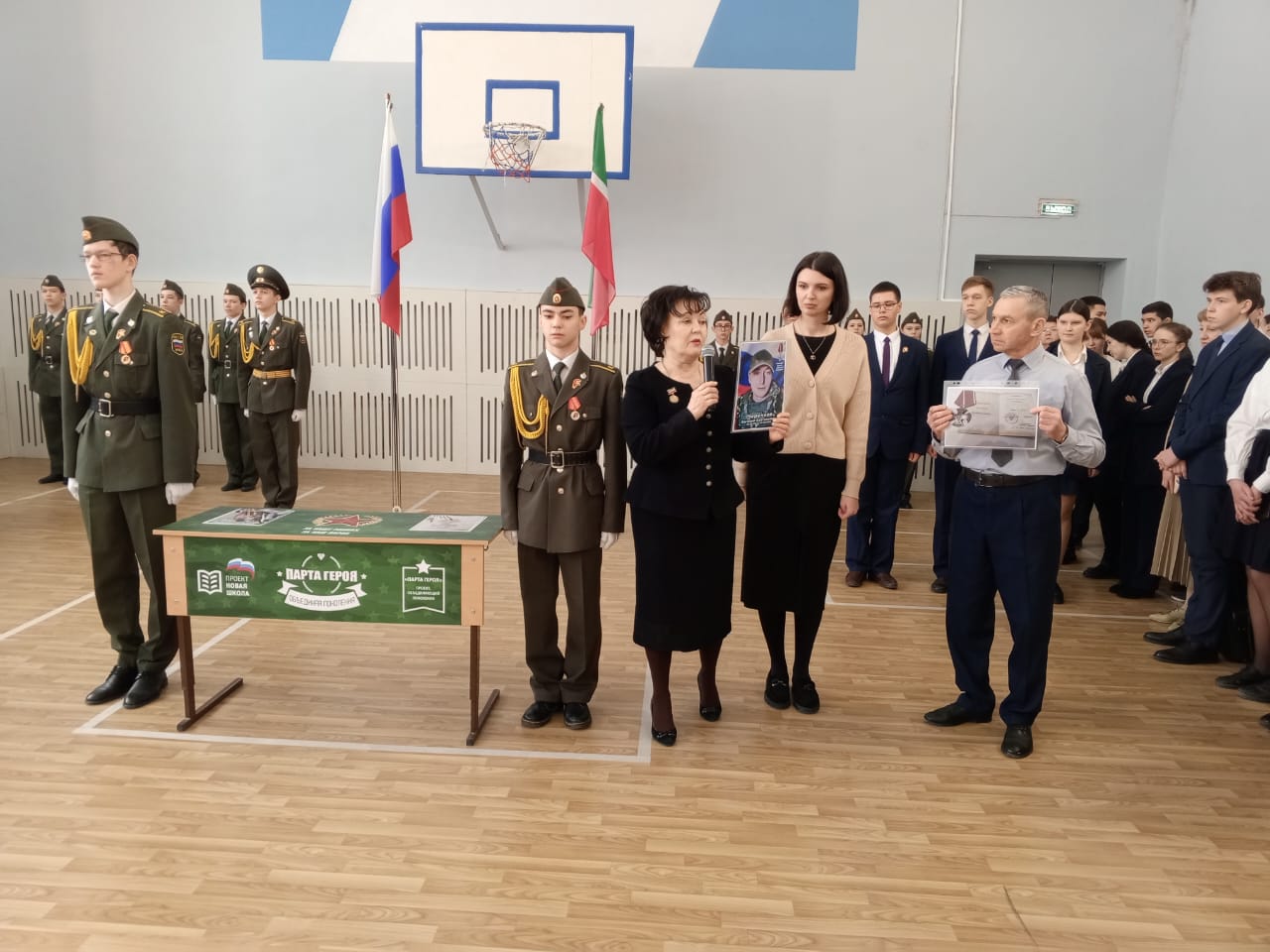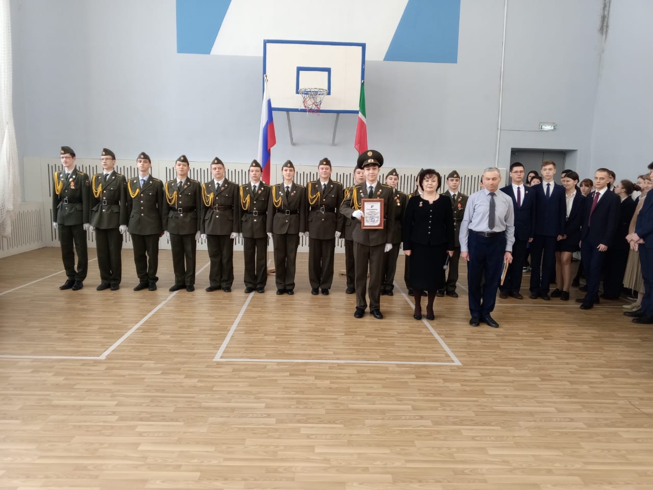 Традиционно поздравили призеров конкурсов: Тагирова А., ученика 8 класса, Адиатуллину С., ученицу 9 класса, Романова М., ученика 8 класса - победителей смотра-конкурса строя и песни "Статен в строю, силён в бою" среди юнармейских отрядов Зеленодольского муниципального района; Аглуллина Д., ученика 10 класса, капитана команды, занявшей 1 место в соревнованиях "Снайперская дуэль с элементами выживания", посвященных годовщине вывода советских войск из Афганистана и Дню Защитника Отечества.