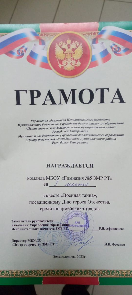 Команда гимназии 5 заняла I место в квесте "Военная тайна" посвященному Дню героев Отечества среди юнармейских отрядов! Поздравляем! Так же ученик 11 класса Шарафутдинов Адель был награжден дипломом за активное участие в юнармейских отрядах! Гордимся!????