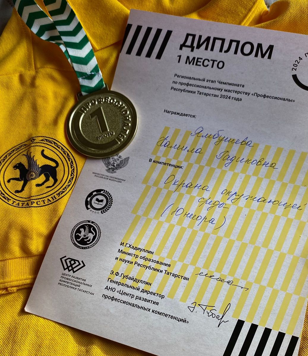 С 11 по 14 марта 2024 года на базе Казанского нефтехимического колледжа имени В.П. Лушникова прошел чемпионат республики Татарстан по профессиональному мастерству "Профессионалы" по компетенции "Охрана окружающей среды" среди юниоров, где наша ученица 10 класса Ямбушева Камила Радиковна в упорной борьбе среди лучших ребят из разных школ стала победителем и будет представлять нашу республику на федеральном уровне.
