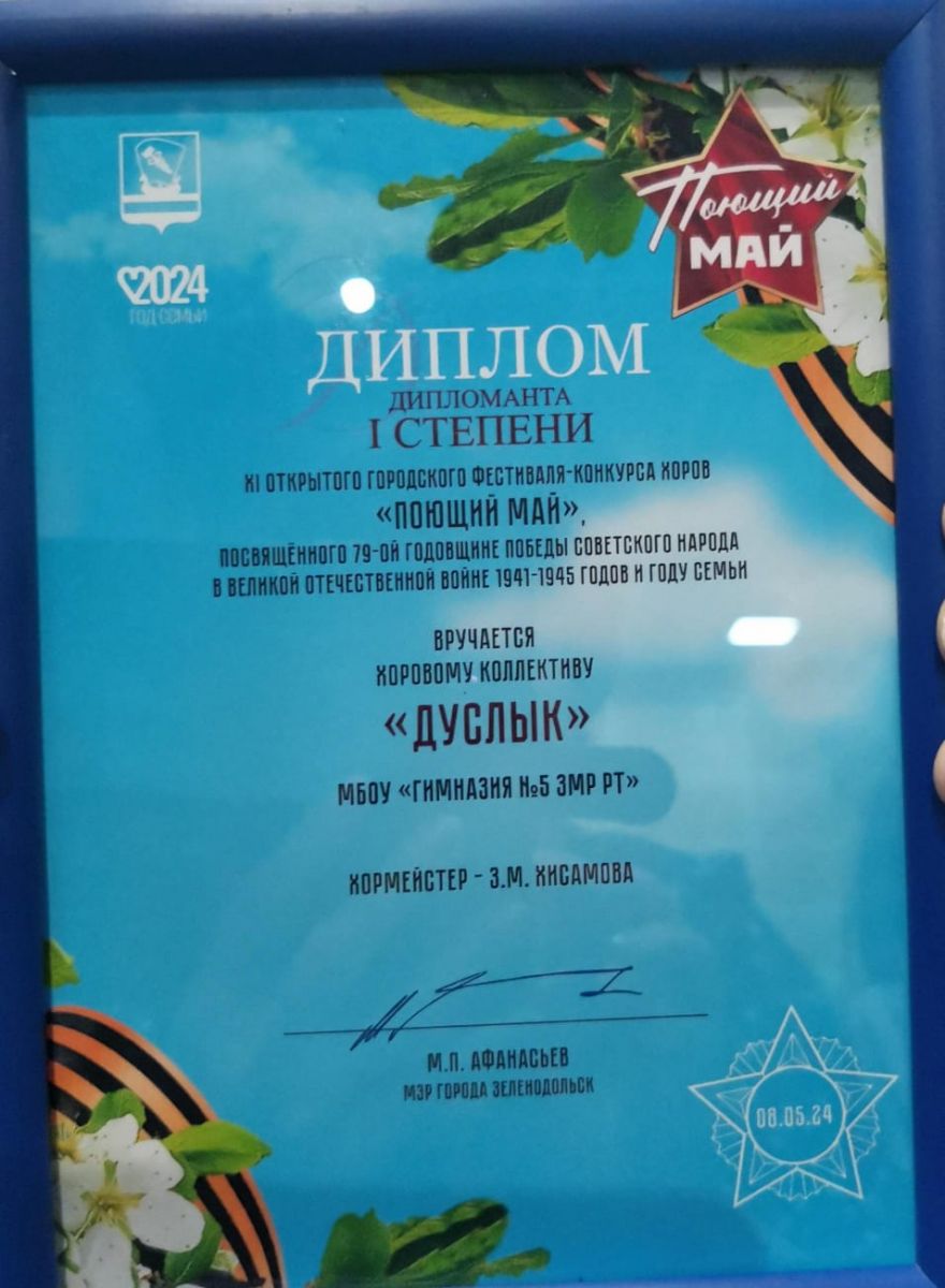 Поздравляем хоровой коллектив «Дуслык» гимназии и его руководителя Хисамова Зульфию Мирзаевну с 1 местом в IX открытом городском фестивале-конкурсе хоров «Поющий май», посвященному 79-ой годовщине Победы.