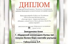 Мәктәбебезнең 8 нче сыйныф укучысы Зиятдинова Алия бөек шагыйребез Габдулла Тукайның 134-еллыгына багышланга "Телләр төрле - йөрәкләр бердәм!" дип аталган шигырь бәйрәмендә катнашып, III урын алды. Чын күңелдән аны котлыйбыз, киләчәктә дә уңышлар гына юлдаш булсын.