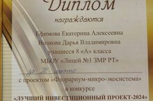 Традиционно наш лицей принял участие в муниципальном конкурсе "Лучший инвестиционный проект - 2024",организованном Автономным учреждением Зеленодольского муниципального района "Инвестиционный центр "Зеленый Дол". 15 команд из образовательных учреждений Зеленодольского муниципального района соревновались за звание "Лучший инвестиционный проект". Поздравляем обучающихся 8А класса Ефимову Екатерину и Волкову Дарью с призовым местом в конкурсе, которые, совместно с куратором- учитлем биологии Хайруллиной Г.И.- представили свой проект "Флорариум - микро-экосистема". Желаем новых проектов и новых побед!