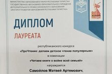 Поздравляем ученика 3Г класса Самойлова Матвея - призера республиканского конкурса "ПроЧтение: делаем детское чтение популярным" в номинации "Читаем книги о войне всей семьей".