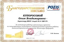 Благодарность за активную работу по реализации проекта "Инженеры будущего" 11.08.2017
