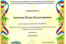 23 декабря Территориальной профсоюзной организацией работников образования и науки Зеленодольского муниципального района Республики Татарстан проведён конкурс "Педагогический дебют - 2015". От нашей школы в этом конкурсе приняла участие Зинатова Юлия Владимировна, которая стала победителем в номинации "Академизм"