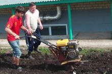 Наши воспитанники плечом к плечу с Дамиром Кабировичем с удовольствием работают на земле. Под чутким руководством директора ребята легко справляются с техникой.