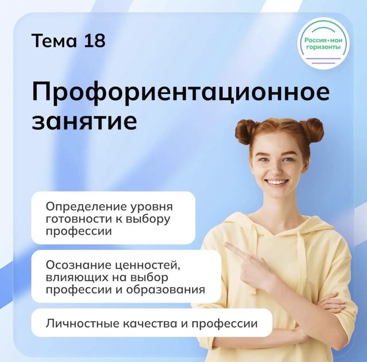 В 7, 9 и 11 классах прошло занятие по теме «Мои ориентиры» — внимание было сосредоточено на определении готовности к выбору профессии, осознании ценностей, влияющих на этот выбор, и понимании того, как подойти к нему более взвешенно и осознанно. -
