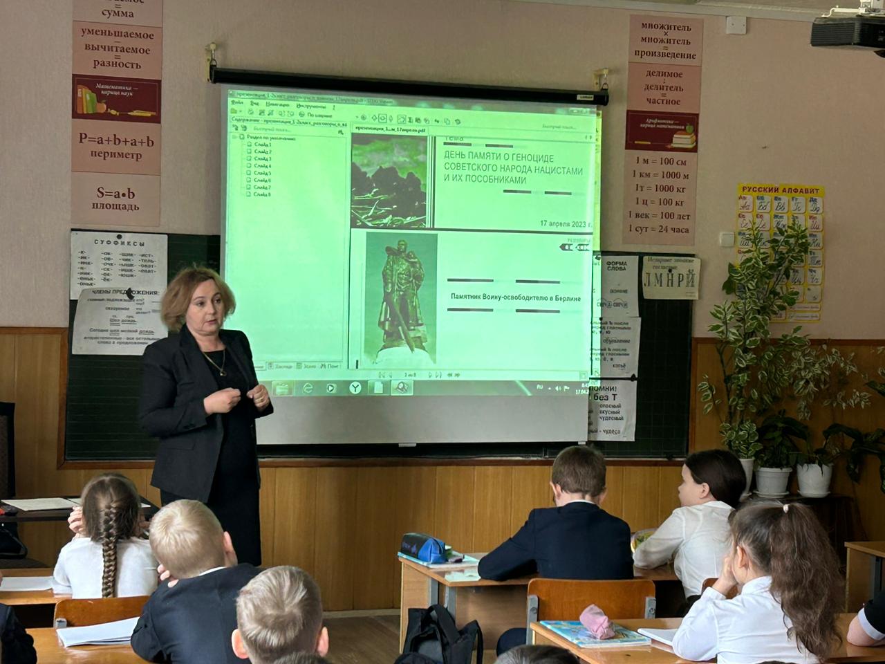 В 1-4-х классов разговор вели о том, что СССР победил в Великой Отечественной войне благодаря сплоченности народа и мужеству армии. В Германии, которая напала на СССР, стоит памятник «Воину-освободителю», история которого связана с подвигом Николая Масалова. О нем ребята узнали, посмотрев видео. Затем школьники посмотрели фотографии мемориалов и памятников, посвященных жертвам войны.