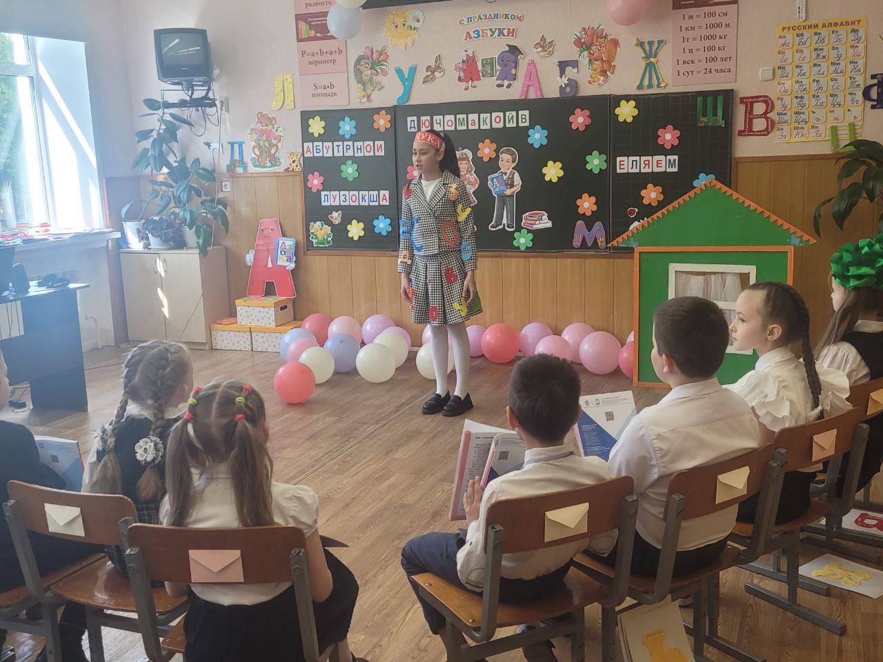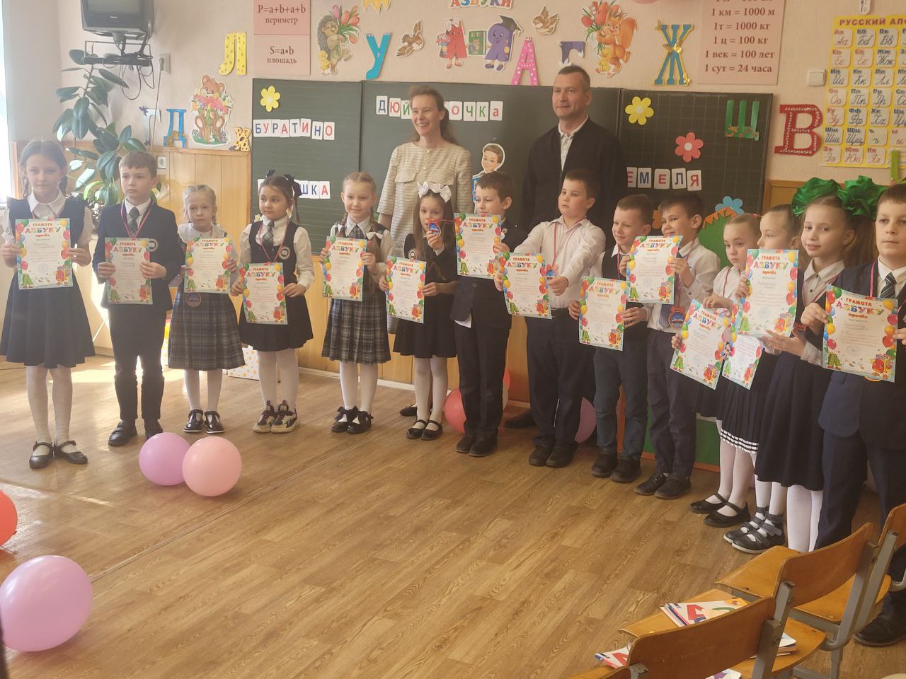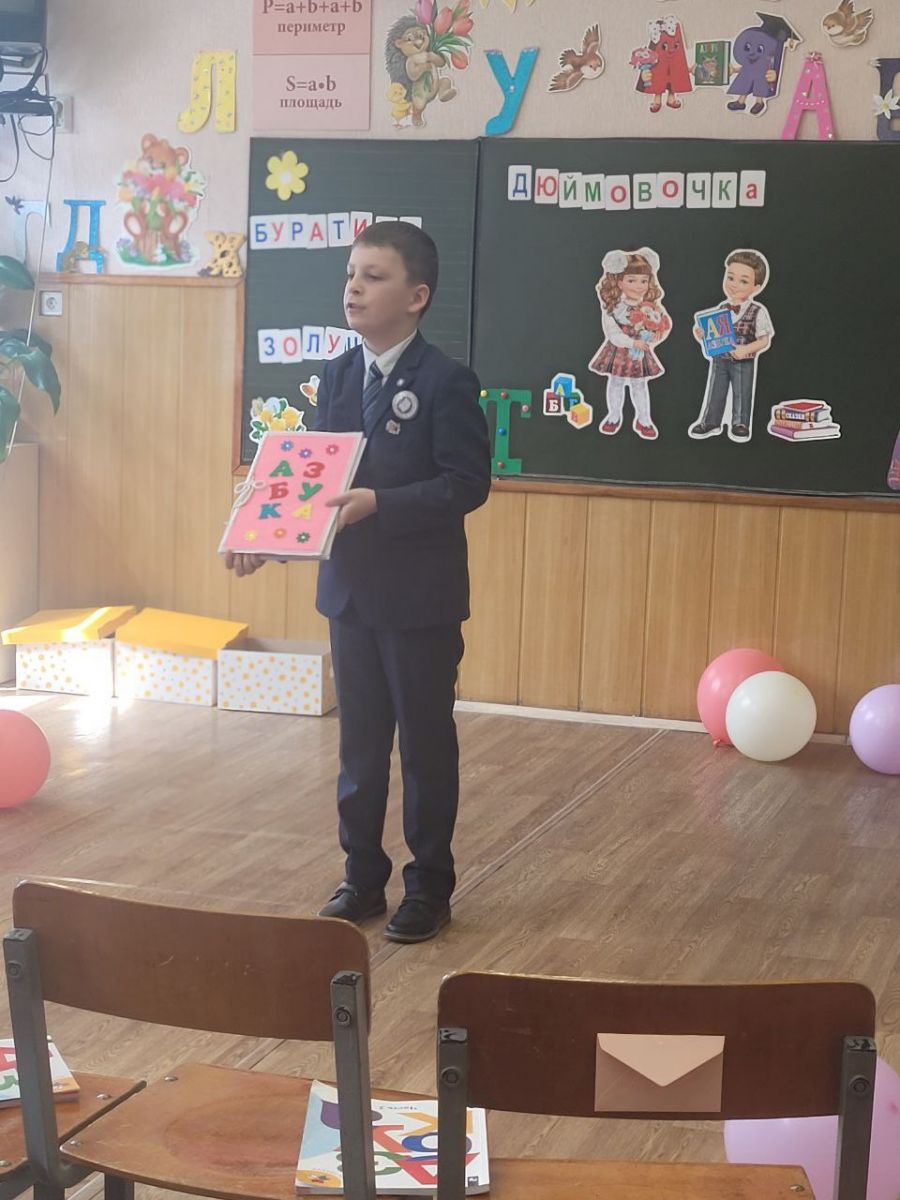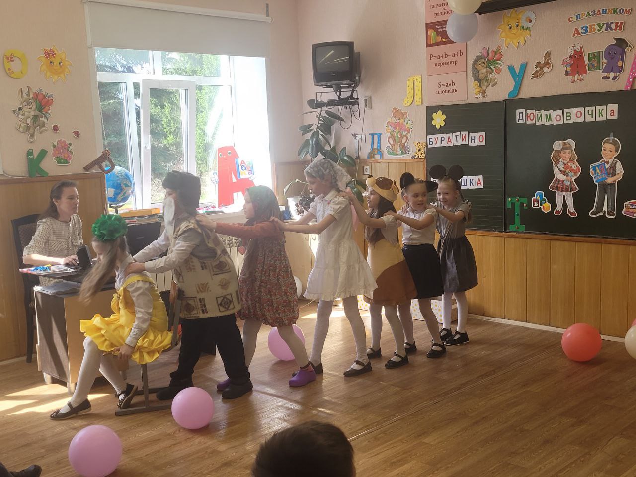 Опубликовано: 20.04.2024Праздник «Прощание с Азбукой» в 1 классе. 20 апреля 2024 г в нашей школе в 1 классе прошёл праздник «Прощание с Азбукой». Он был посвящён первой школьной победе первоклассников, которую они одержали благодаря старанию, трудолюбию и желанию учиться. Ребята выучили все буквы русского алфавита, научились читать и писать. В рамках проекта «Живая Азбука» ученики подготовили к празднику рисунки букв и стихи о них. Страницы «Азбуки» учили ребят не только грамоте, но и быть дружными, воспитанными учениками, поэтому на празднике звучали стихи, песни, дети показали сказку " Репка". В гости пришли сказочные герои: Буратино, Золушка, Красная Шапочка, Лисичка. Проверили, как ребята знают буквы алфавита, умеют читать,отвечать на вопросы.На празднике присутствовали родители и гости. Родители были рады успехам своих детей. Директор школы поздравил ребят, сказав, что алфавит — это ключ к изучению разных предметов и наук, и пожелал быть старательными и ответственными учениками, пожелал успехов в учёбе.