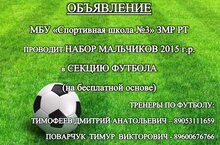 МБУ "Спортивная школа №3" ЗМР РТ объявляет дополнительный набор детей 2016 г.р., 2017 г.р. в платные группы по футболу.