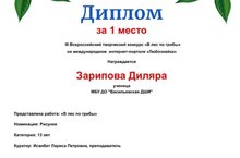 Поздравляем учащихся художественного отделения Васильевской ДШИ преподавателя Ситдиковой Н.В. с победами в Международном конкурсе «Твори!Участвуй!Побеждай!» Абдуллину Олесю, Зинатуллину Айшу,Титову Арину-Дипломы за 1 место!А так же их преподавателя Ситдикову Н.В. с Дипломом за 1 место. Желаем новых побед!