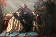 Рубрика "80 дней до Победы" День 11. Федор Богородский "СЛАВА ПАВШИМ ГЕРОЯМ" 1945 год Работа Богородского посвящена всем матерям, потерявшим на войне сыновей. По статистике, с фронта не вернулся каждый третий мужчина в возрасте от 20 до 35 лет. И это горе не могла затмить даже всеобщая радость Победы. Над телом погибшего матроса склонилась мать. Рядом, словно в почетном карауле, стоят сослуживцы. У смертного ложа, молча преклонив колена, благодарит героя капитан. А красная звезда на флаге Военно-морского флота словно освещает лицо погибшего юноши. И если вы знакомы с историей живописи, композиция картины не может не напомнить икону "Положение Христа во гроб", где над телом погибшего сына склоняется Богородица, а вокруг стоят ученики, оплакивая Учителя. Такая параллель неслучайна и не раз встречается в работах художников на военную тему. Погибших солдат и Христа объединяет миссия спасителя: они отдавали жизнь за мир, за спасение миллионов людей. 01.03.2025