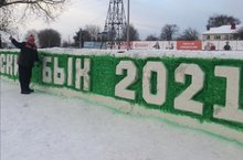 Преподаватели Макаров В.И. и Царев С.В. вырезали и расписали снежную надпись "Зеленодольский бык 2021" на ул.Столичная возле символа 2021 года Быка 20.12.2020