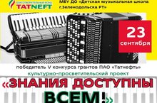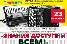 23 сентября в Детской музыкальной школе прошли мастер-классы и концерт в рамках реализации культурно-просветительского проекта «Знания доступны всем!» - победителя конкурса Грантов Компании ПАО «Татнефть». Проект разработан преподавателями Казанского музыкального колледжа им.И.В.Аухадеева и направлен на повышение интереса детей и молодежи к музыкальному искусству. Детская музыкальная школа города Зеленодольска вошла в список учреждений культуры Республики Татарстан, в которых проводятся концерты и мастер-классы в рамках данного проекта. Мастер-классы для учащихся и преподавателей ДМШ и ДШИ провели: