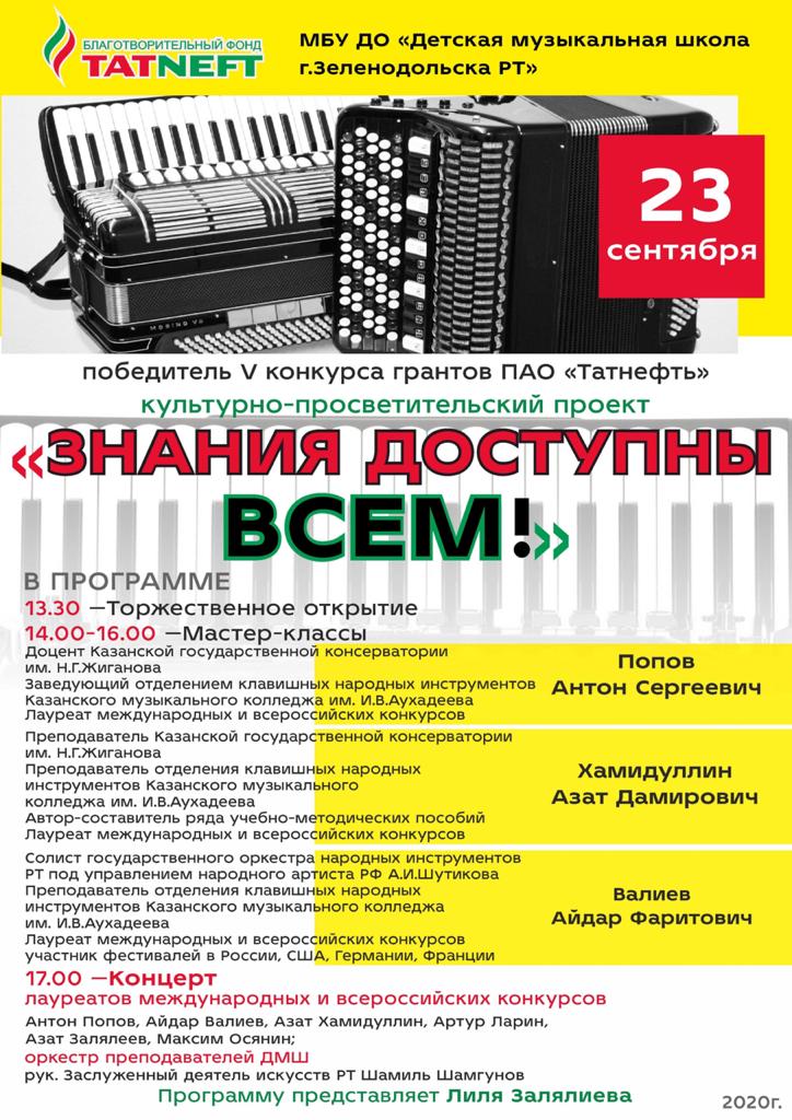 Опубликовано: 21.09.202023 сентября 2020 года в Детской музыкальной школе города Зеленодольска в рамках реализации культурно-просветительского проекта "Знания доступны всем" состоятся мастер-классы и концертная программа с участием преподавателей и студентов Козанского музыкального колледжа им. И.В.Аухадеева, Казанской Государственной консерватории им. Н.Г.Жиганова. В концерте примет участие Оркестр преподавателей ДМШ.