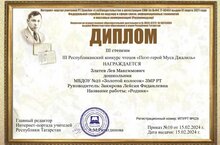 Урта төркем тәрбияләнүчесе Гибадуллина Инзилә Илнур кызы һәм әзерлек төркеме тәрбияләнүчесе Златев Лев Максимович " Шагыйрь – герой Муса Җәлил «III Республика укучылар конкурсында бик яхшы катнаштылар! Җиңү белән котлыйбыз!!!