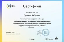25.01.24 г. воспитатели МБДОУ №23 "Золотой колосок" ЗМР РТ приняли участие в вебинаре «Обучение детей с различными образовательными потребностями: цифровые ресурсы для проведения коррекционно-развивающей работы» от МЭО Детский сад.Ведущий методист Горностаев Игорь Сергеевич поделился полезной информацией: использование цифрового помощника для повышения мотивации к занятиям у детей и отражается на прочном результате логопедической работы.