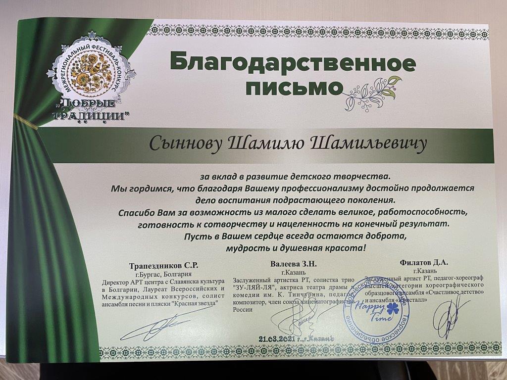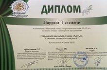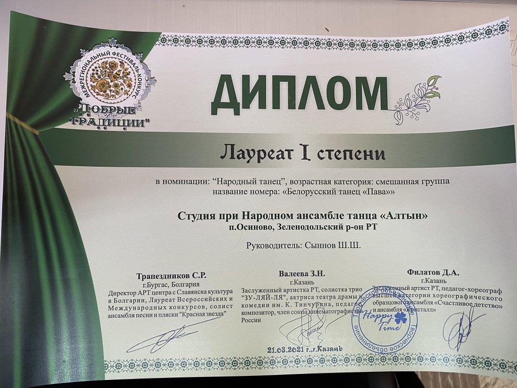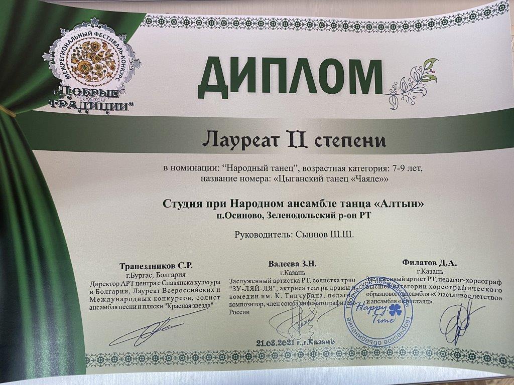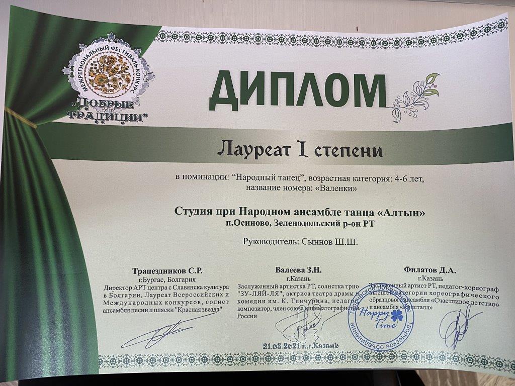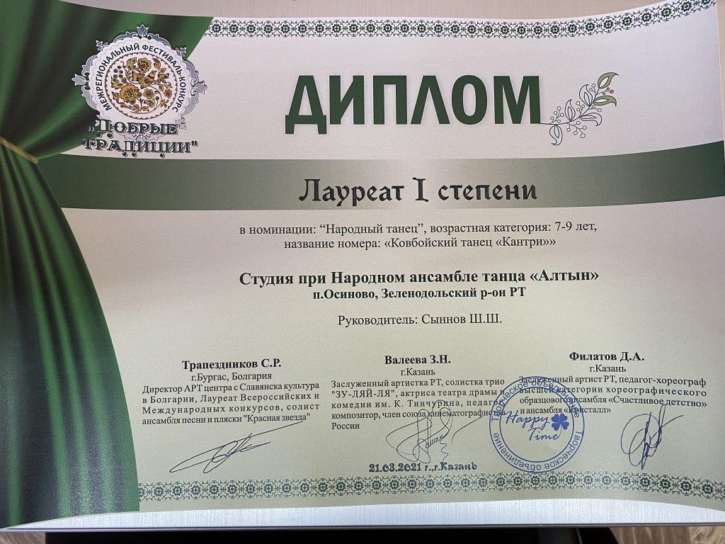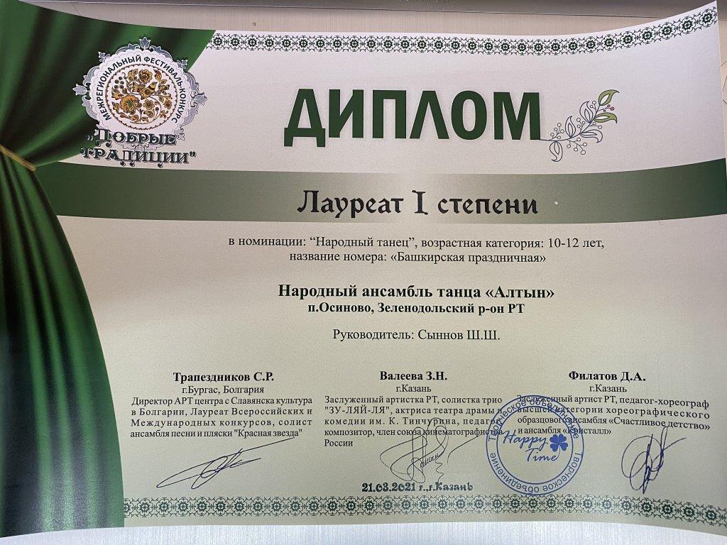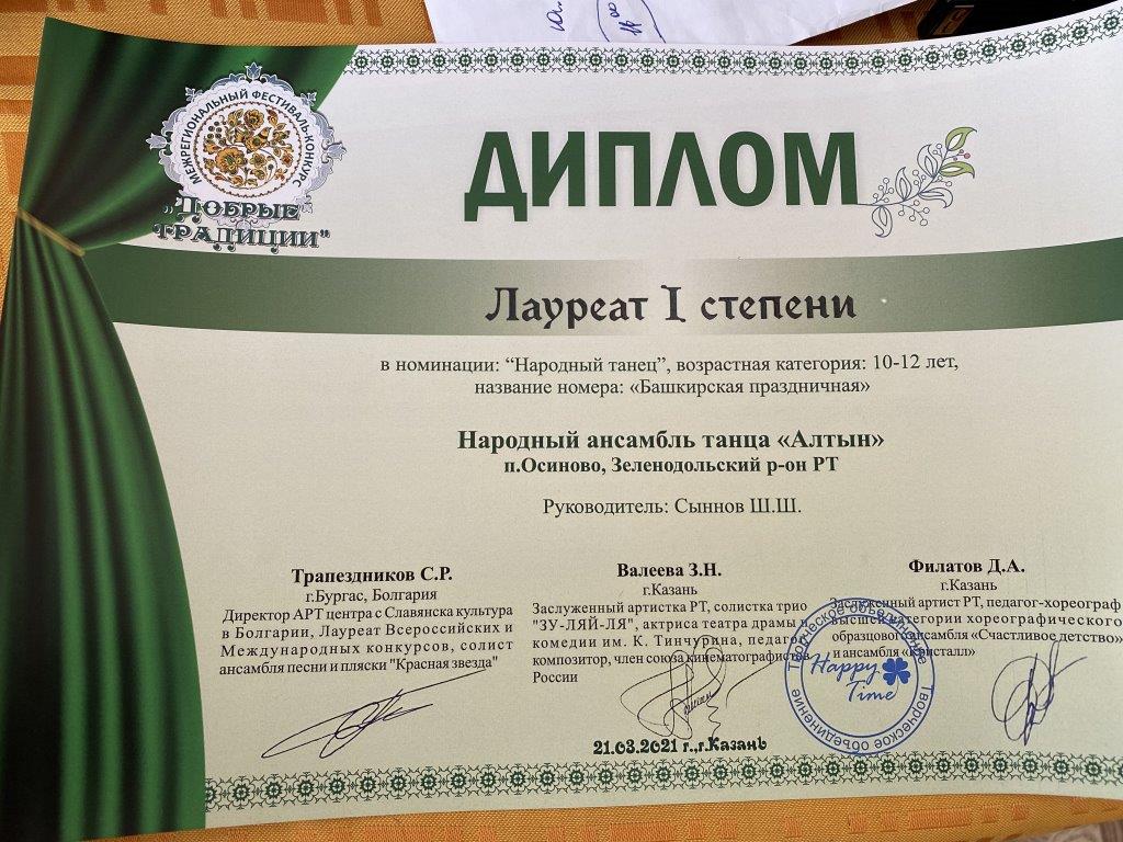 21 марта 2021 года учащиеся объединения «Алтын приняли участие в Межрегиональном фестивале-конкурсе «Добрые традиции», проходившем в городе Казань. Были представлены 7 хореографических композиций: «Валенки», «Ковбойский танец «Кантри», «Белорусский танец «Пава», «Закарпатский танец», «Башкирский танец», «Цыганский танец» и солист исполнил «Татарский танец». Все выступления удостоены высоких наград - 5 первых мест и 2 вторых!!! В активе объединения ещё и специальный приз фестиваля-конкурса «Лучший Народный танец»!