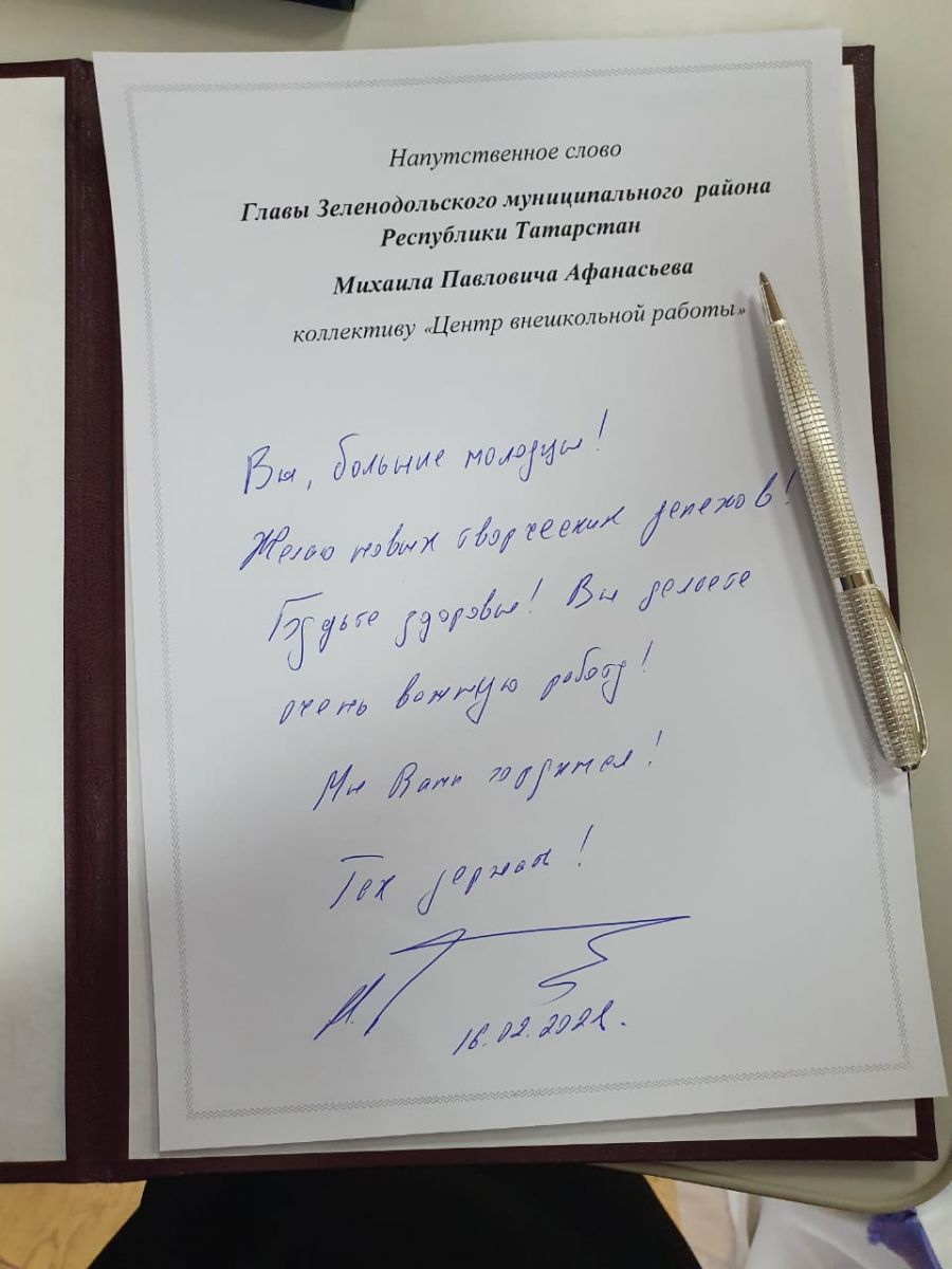 После посещения выставки Михаил Павлович написал напутственное слово коллективу МБУ ДО «Центр внешкольной работы ЗМР РТ»!