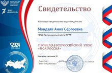 Учащиеся объединения "Я - патриот" приняли участие во Всероссийском уроке "Моя Россия". Цель урока – знакомство детей с историческими, культурными и природными достопримечательностями современной России. Презентация «Моя Россия» поведала детям о таких семи чудесах России, как озеро Байкал, долина Гейзеров, гора Эльбрус, Столбы выветривания, Мамаев Курган и Родина-мать, Храм Василия Блаженного, Петергоф!