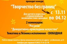 C 13 ноября по 4 декабря 2023 года проводится конкурс "Творчество без границ" для детей и взрослых с ограниченными возможностями здоровья!