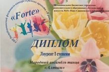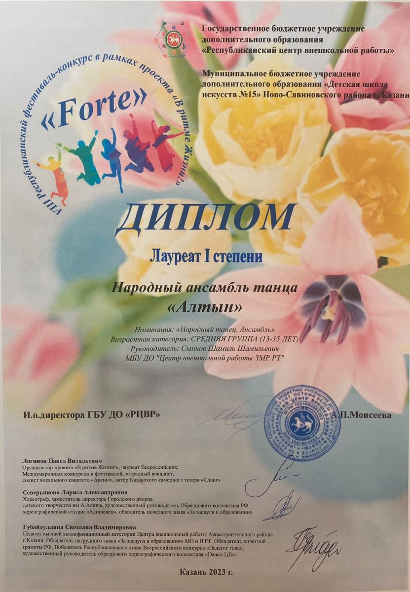 23 апреля 2023 года объединение "Алтын" на VIII Республиканском фестивале-конкурсе «Forte» в рамках проекта «В ритме Жизни!» стали Лауреатами 1 степени с хореографической композицией Удмуртский танец «Шулдыр эктон»! Награда очень ценная - 1 место по условиям конкурса присуждалось только одному коллективу в одной номинации и возрастной группе! /upload/storage/org986/files/20230423 Forte 1.jpg /upload/storage/org986/files/20230423 Forte 2.jpg и еще фото https://vk.com/altynkzn?z=photo-23563769_457243128%2Fwall-23563769_5106