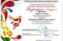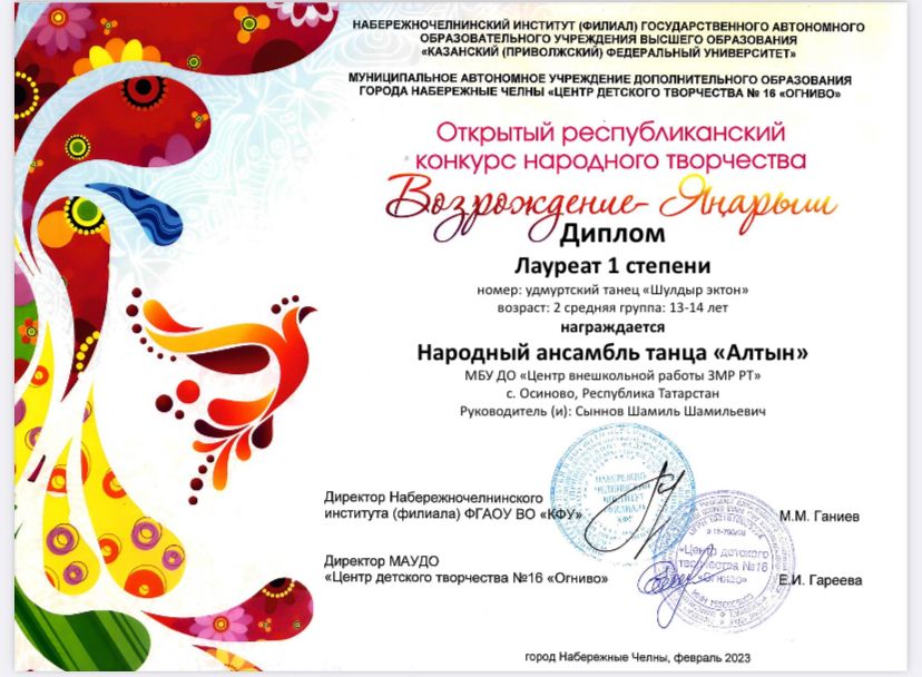 В феврале 2023 года объединение «Алтын» приняло участие в Открытом республиканском конкурсе народного творчества «Возрождение - Янарыш» с хореографической композицией Удмуртский танец «Шулдыр эктон». Конкурс проходил в Набережных Челнах в онлайн формате. Сегодня стали известны итоги конкурса: жюри вручило нашим исполнителям за этот танец Диплом Лауреатов 1 степени! Поздравляем нашего педагога Сыннова Ш.Ш., девочек и мальчиков с победой! Фото /upload/storage/org986/files/20230315 Алтын.jpg /upload/storage/org986/files/20230315 Алтын 2.jpg