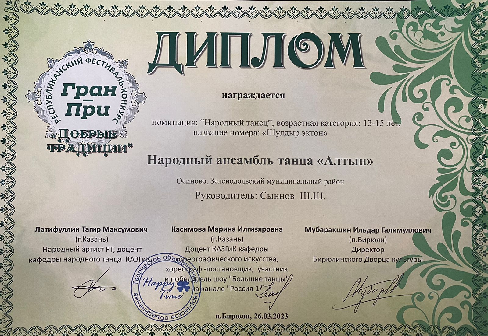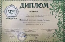 26 марта 2023 года объединение «Алтын» приняло участие в Республиканском фестивале - конкурсе «Добрые традиции» в поселке Бирюли, куда съехались творческие коллективы со всей Республики! Наш ансамбль представил удмуртский танец «Шулдыр эктон» и стал обладателем ГРАН-ПРИ фестиваля! Наши очередное восхищение и поздравления!!! /upload/storage/org986/files/20230326 ГРАН_ПРИ.jpg